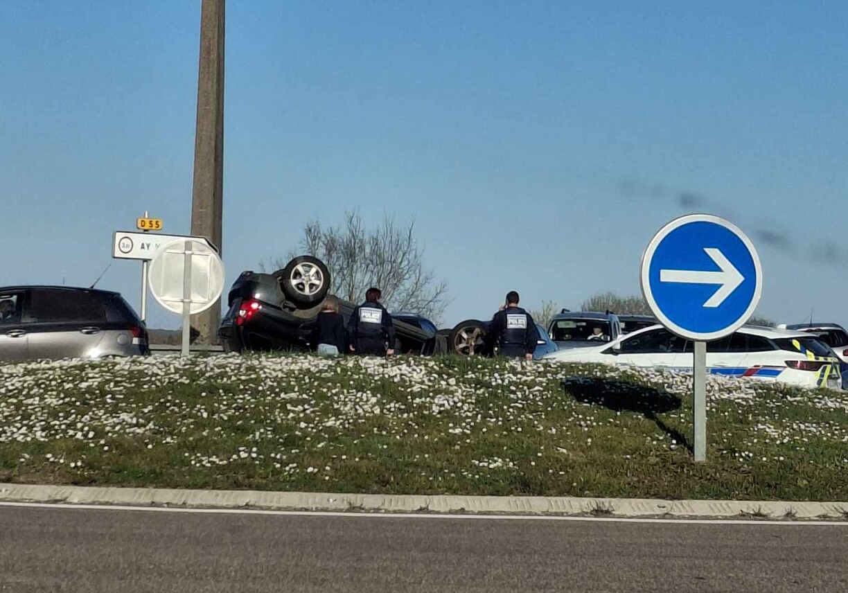 L’un des deux véhicules a terminé sa course sur le toit en plein milieu du rond point situé sur la D55, placé avant le chemin d’Hauconcourt qui mène à l’A31 dans le sens Metz-Luxembourg et au Marques Avenue, dans le sens Thionville-Metz.