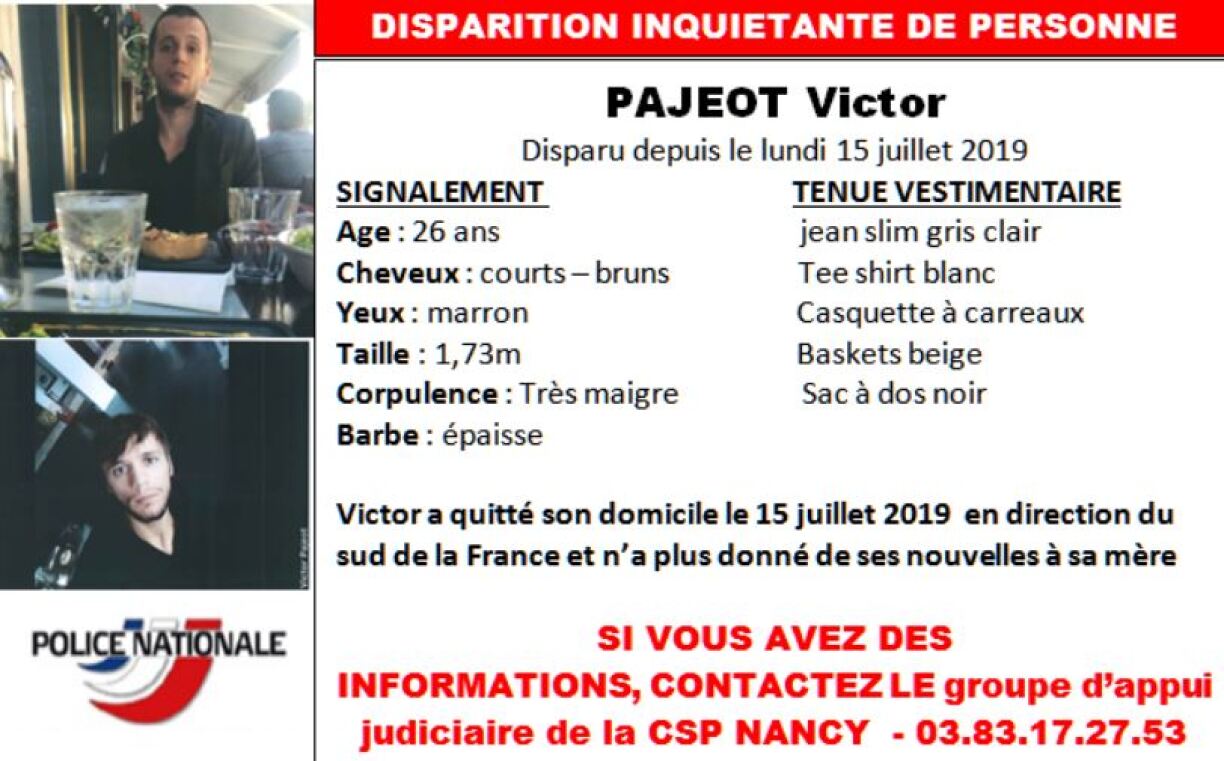 Via son compte Twitter, la police nationale de Meurthe-et-Moselle (54) a lancé un appel à témoins concernant Victor Pajeot, disparu depuis le 15 juillet.