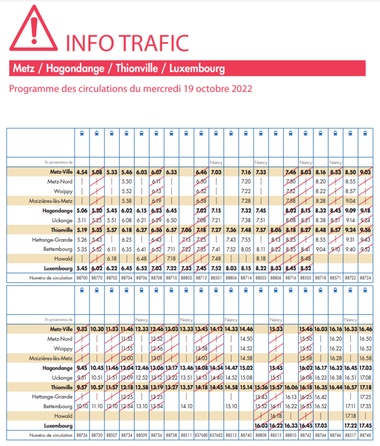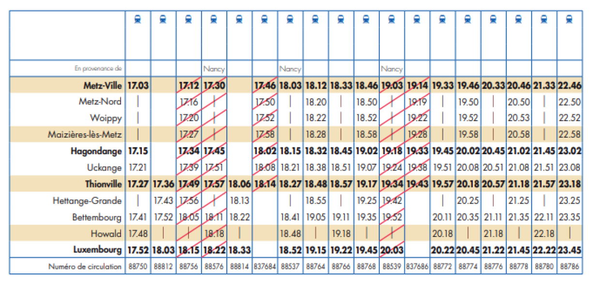 Le matin, six trains ont été supprimés entre la ville mosellane et la capitale luxembourgeoise. Le dernier train pour rejoindre Luxembourg partira à 7h33 de Metz et à 7h57 de Thionville. D’autres trains, partant de Thionville ou s’arrêtant habituellement à Bettembourg, ont également été annulés. Au total, 19 trains sur 40 ont été supprimés dans le sens Metz - Luxembourg.