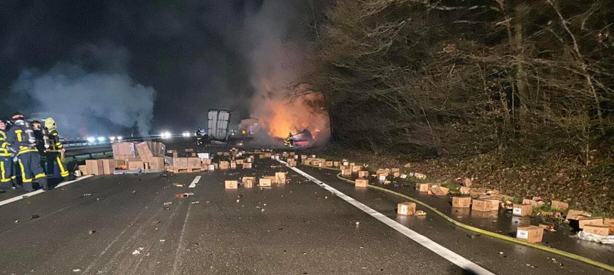 Les flammes, alimentées par la cargaison du poids lourd, ont mesuré jusqu’à plusieurs mètres de hauteur, barré tout passage à côté du camion et embrasé le bas-côté.