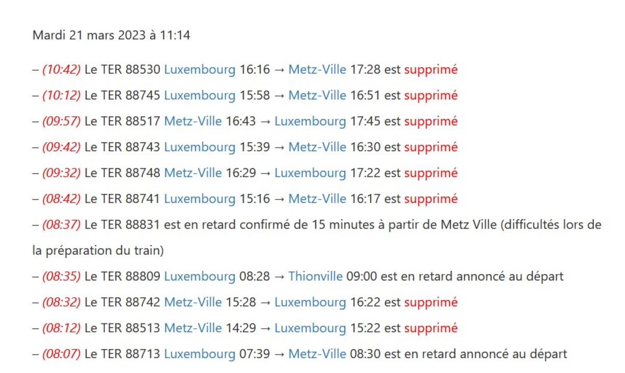 Selon les dernières informations, des annulations et de nouveaux retards sont encore prévus tout au long de la journée, sans oublier des bus de substitution qui devraient remplacer certains trains vers Thionville ou Metz en soirée.
