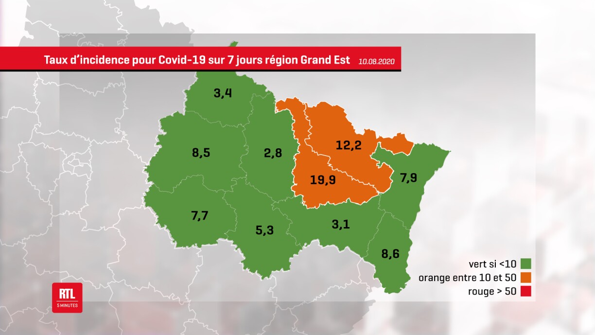 Après la Meurthe-et-Moselle déjà en orange depuis plusieurs jours, la Moselle voit à son tour son taux d’incidence dépasser les 10. Le taux d’incidence correspond au nombre total de nouveaux cas dans un délai de 7 jours pour 100.000 habitants. L’indicateur est vert si ce chiffre est inférieur à 10, orange s’il est compris entre 10 et 50, et rouge au-delà de 50.