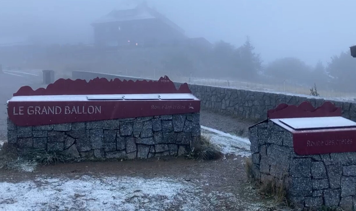 Comme le rapporte notamment la page facebook Infos Ski & Neige Vosges, le “saupoudrage annoncé” était bien au rendez-vous ce samedi matin au Grand Ballon (1343 m). “Le thermomètre affiche zéro degré, la neige tombe par averses et le vent souffle parfois en tempête”.