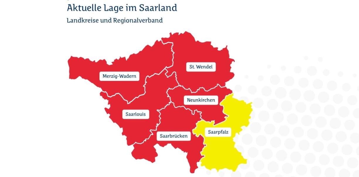 Alors qu’en Moselle voisine, le nombre de nouvelles infections est en très forte baisse, la Sarre affiche un taux d’incidence de plus de 139 sur les sept derniers jours selon le Robert Koch Institut (RKI) ce mercredi. Après avoir été tiré dans cinq des six cantons que compte la Sarre, le “frein d’urgence” vient d’être actionné en Saarpfalz et de faire virer tout le Land au rouge ce mercredi. Le canton de Merzig-Wadern qui forme la frontière avec le Luxembourg a viré au rouge mardi.
