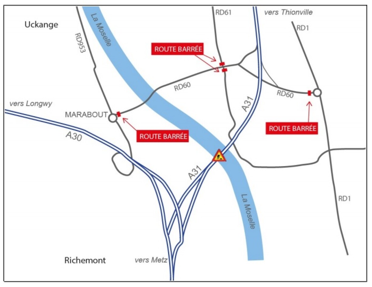La RD 60 sera également fermée entre Guénange et Uckange sur les mêmes horaires pour faciliter l’écoulement du trafic en provenance de l’A31.