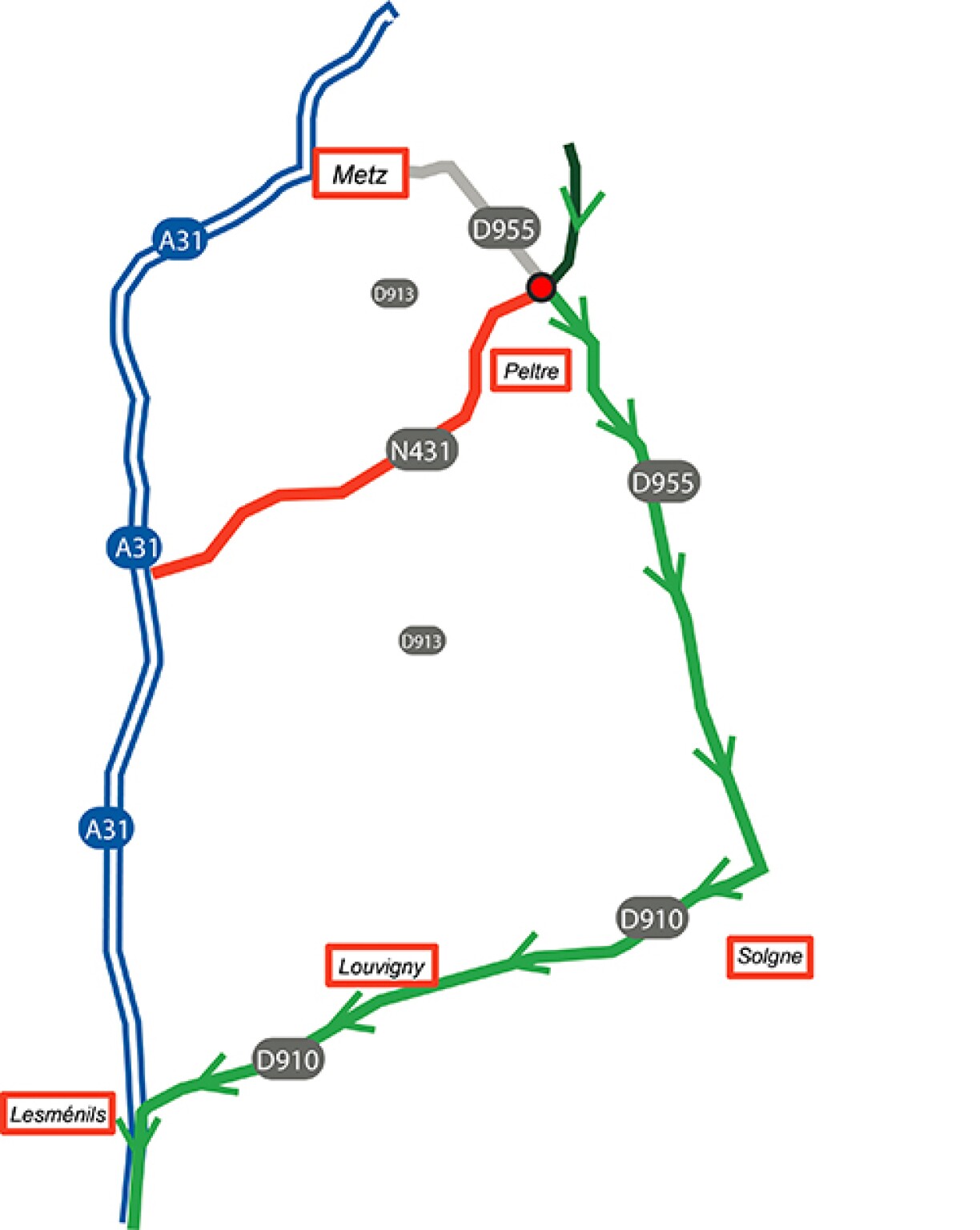 Un itinéraire de substitution est mis en place. La déviation obligera les usagers à sortir à l’échangeur de Hauconcourt pour suivre l’A4, l’A315, la RN431 puis les M955/D955 et enfin la D910 pour retrouver l’A31 par l’échangeur n°28 de Lesmenils.
