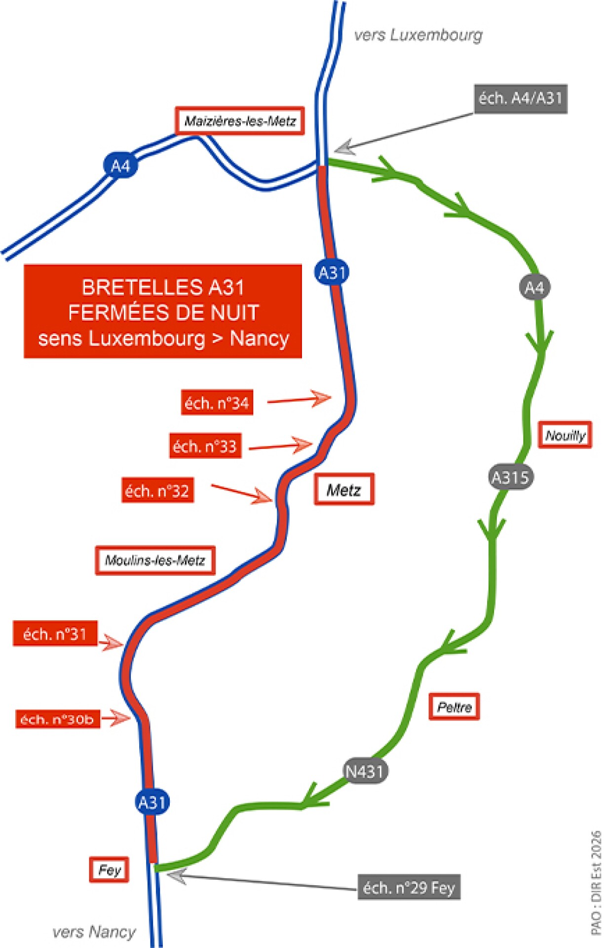 La circulation de jour s’effectuera sur chaussée dégradée et l’A31 sera fermée, de nuit, dans le sens Luxembourg → Nancy au niveau de l’échangeur de Hauconcourt (A4/A31) et jusqu’à l’échangeur n°30b inclus.