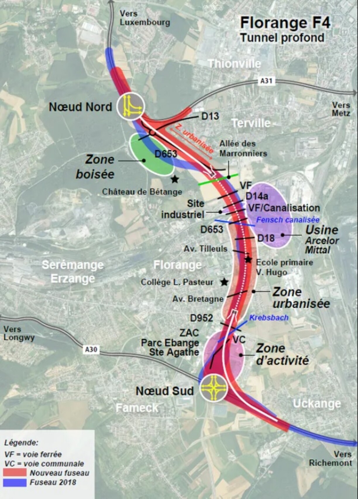 La variante F4 choisie fera passer l’A31bis par un tunnel profond d’une longueur de 2,2 km qui passera sous la ville de Florange - à la grande satisfaction de son maire, Rémi Dick - avant de rejoindre l’A31 au niveau de l’échangeur de Bétange, après la traversée de Thionville.