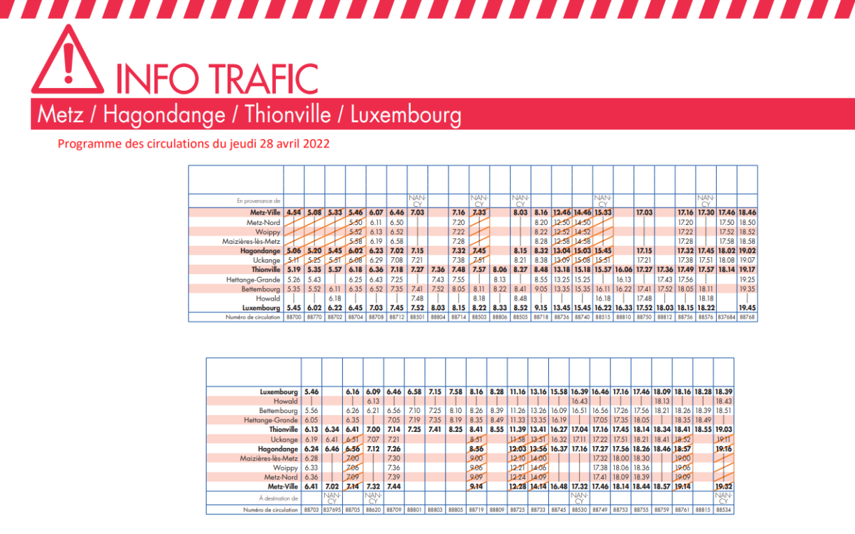 À noter que tous les trains entre Luxembourg et Thionville sont maintenus mais les deux derniers partiront à 18h28 et 18h39 ce jeudi soir: