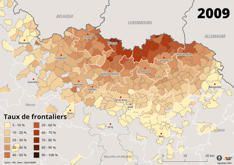 “À l’échelle de la Lorraine Nord, les territoires les plus éloignés de la frontière (Orne Lorraine Confluences, Cœur du Pays-Haut, Damvillers Spincourt) affichent les plus fortes progressions du flux de frontaliers (>+20%)” note l’Agape.