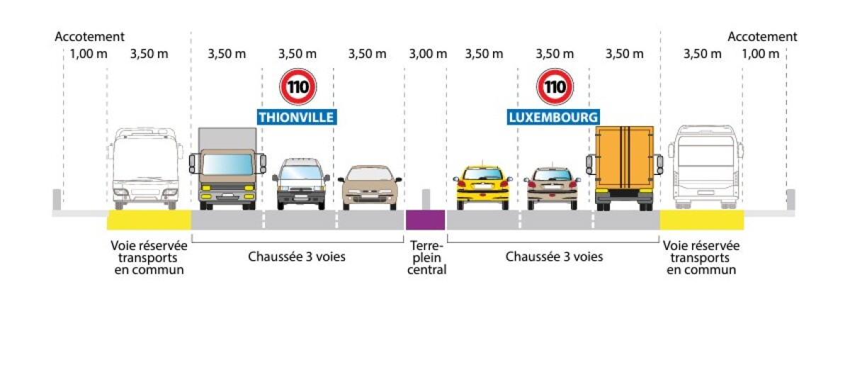 Et le projet prévoit, sur la section entre Thionville et la frontière, en plus de l’ élargissement de l’autoroute à 2x3 voies, l’aménagement d’une voie réservée aux transports en commun sur l’espace de la bande d’arrêt d’urgence. Et cela pour développer le transport collectif par cars transfrontaliers.