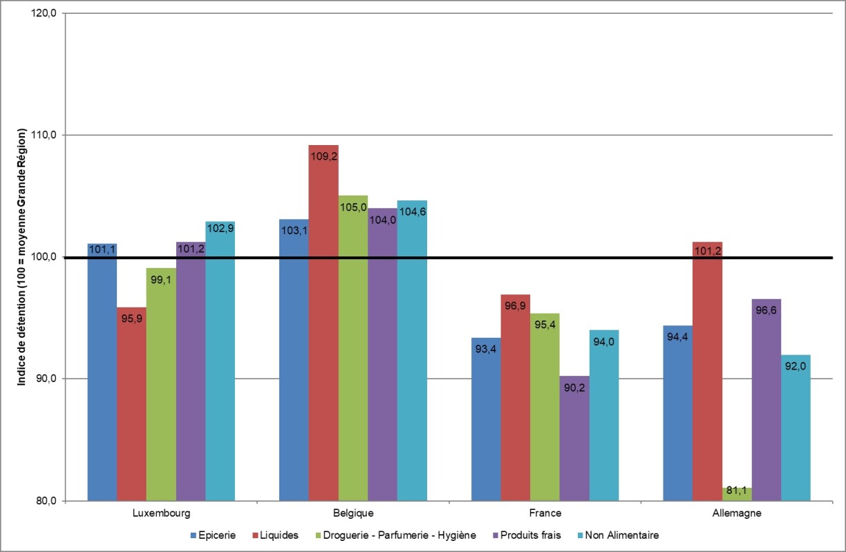 Sur base de l’analyse de plus de 10.000 références, l’Allemagne présente le prix moyen le plus bas de la Grande Région, avec un indice de 93,2 (moyenne de la Grande Région = 100).