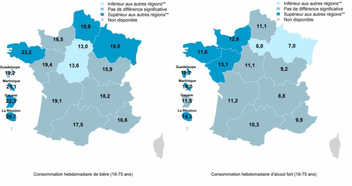 Les disparités se marquent aussi au niveau régional. Sur l’ensemble du territoire, 10% des adultes consomment quotidiennement de l’alcool en moyenne. Ce chiffre varie de 7,1% (Île de France) à 12,6% (Occitanie).