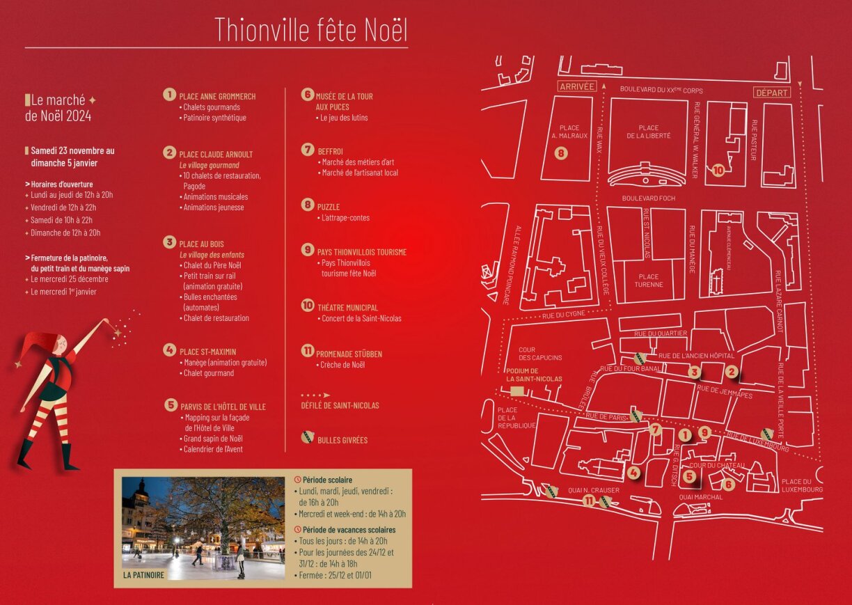 À Thionville, le marché de Noël ouvrira le samedi 23 novembre, jusqu’au dimanche 5 janvier. Les animations seront réparties autour du centre-ville de Thionville, ainsi qu’au théâtre (pour le concert de la Saint-Nicolas) et place Malraux.