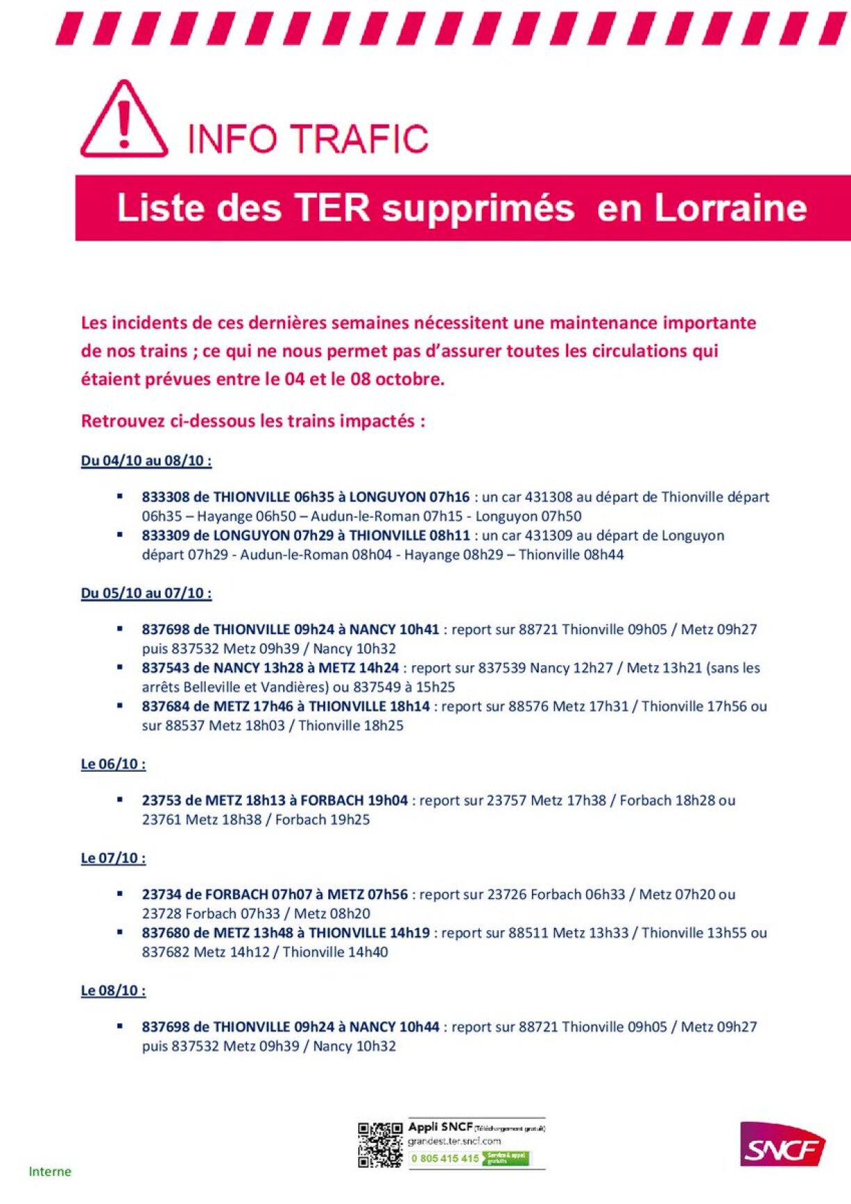 Les trajets impactés relient notamment Thionville, Metz, Forbach ou encore Nancy. Des trains ont soit été reportés sur d’autres horaires prévus, soit remplacés par des bus. Le détail est à retrouver ici: