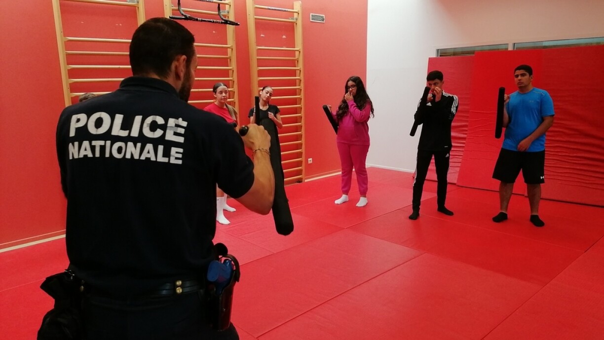 La scène pourrait faire sourire si le contexte n’était pas si tendu. Un jeune des quartiers sensibles de l’agglomération thionvilloise est invité à frapper un policier avec un bâton. Nous sommes sur le tatami de la salle d’entraînement du commissariat de Thionville où huit jeunes passent la matinée. Ils sortent d’un débat animé avec les forces (de l’ordre) en présence, il est temps de se défouler un peu et de faire retomber la tension. Place aux activités et à la visite des installations.