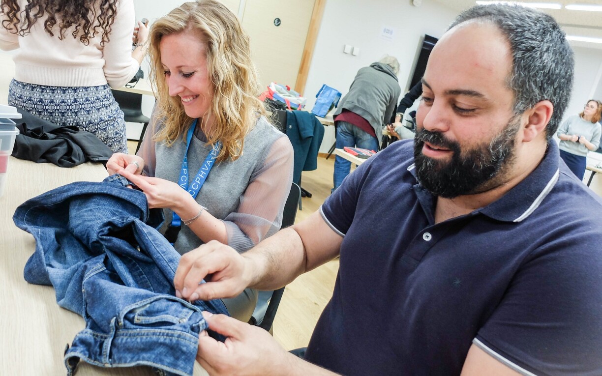 Laure-Sophie Poirée, chargée de mission environnement à la CCPHVA, en profite pour demander des conseils pour réaliser un ourlet: “Ce jean est à ma mère, qui me l’a donné, mais l’ourlet était fatigué. Je veux apprendre à le faire. C’est facile de racheter, mais c’est mieux de refaire soit-même. Et puis ça me rappelle quand ma mère me faisait des ourlets pour mes vêtements…” sourit-elle.