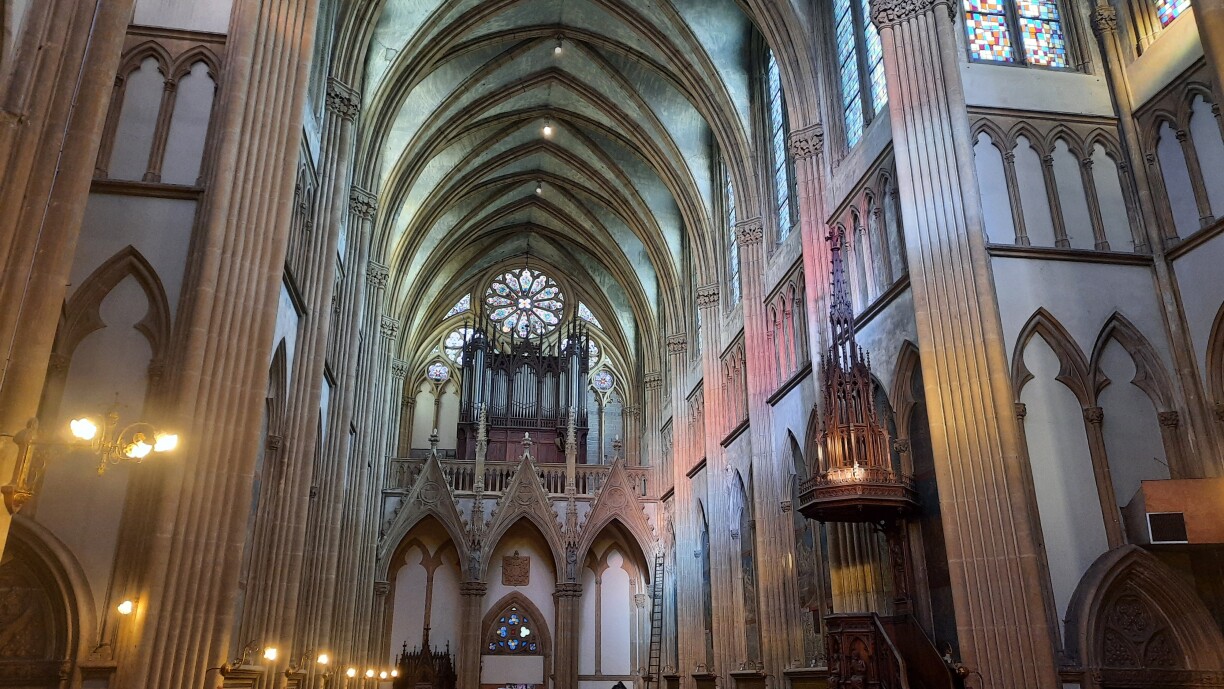 “On l’appelle la cathédrale de la Fensch, parce que son architecture néo-gothique est une réplique de la cathédrale de Metz. Elle a un peu la même forme, en tout cas à l’extérieur. À l’intérieur, c’est vraiment différent, quoique on a quelques traits de la cathédrale qui ressortent quand même. un des traits qui la rapprochent de la cathédrale de Metz, c ‘est que la cathédrale Saint-Etienne, on l’appelle la lanterne du bon Dieu, tellement qu’elle est très éclairée à l’intérieur, c’est un peu le cas ici, avec ces vitraux et ces couleurs, ce jaune, ce bleu qui dominent”, raconte l’abbé Kamm en nous guidant à travers l’église.
