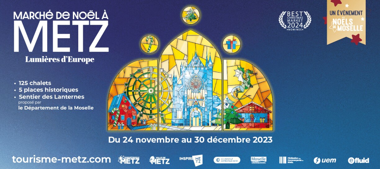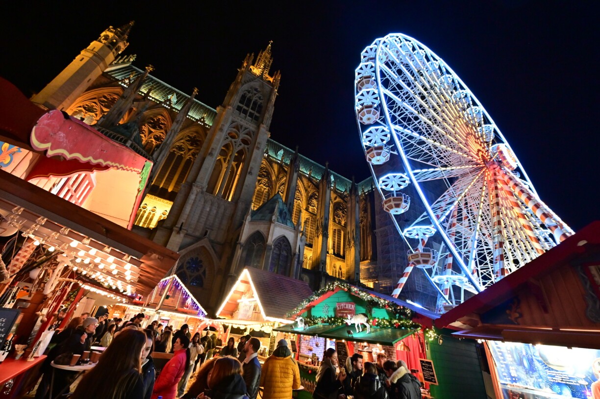 Les 125 chalets du marché de Noël de Metz ouvriront du 24 novembre au 30 décembre sur les places de la ville. Place de la république, vous retrouverez le grand sapin, la City Skyliner pour observer la ville 72 mètres au-dessus du sol, et les marchés locaux “MOSL”.