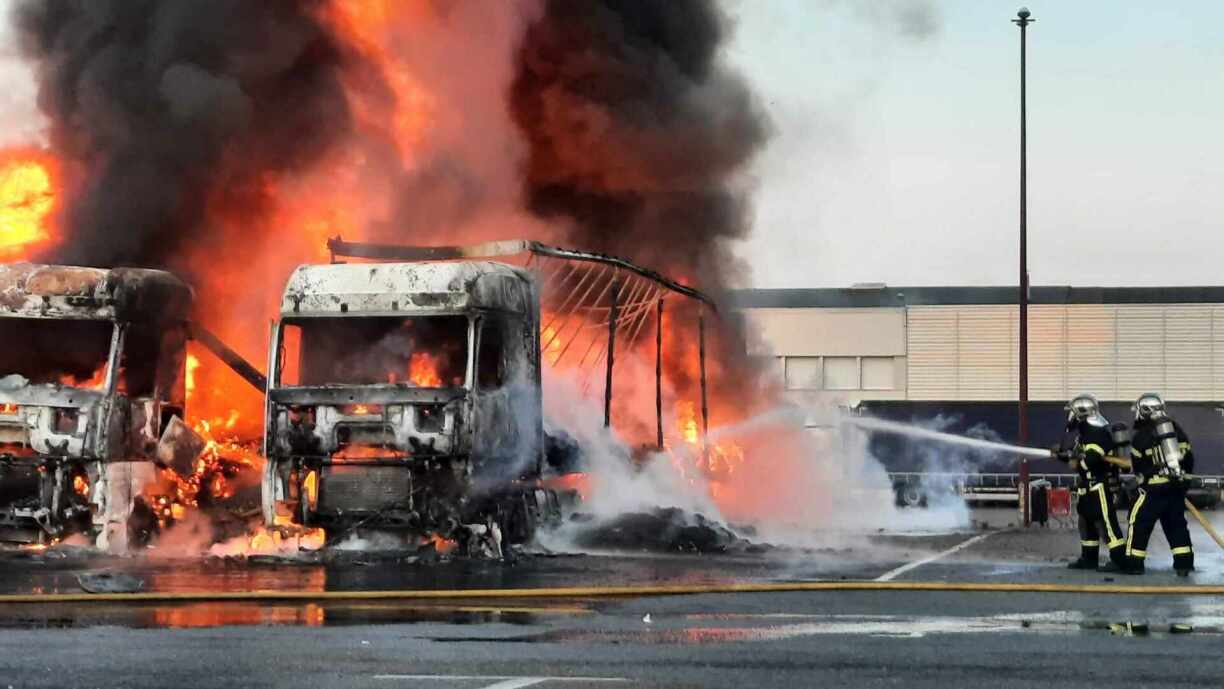 Les flammes menaçant de se propager à un quatrième camion, à proximité immédiate des trois en proie aux flammes qui étaient alignés les uns à côté des autres.