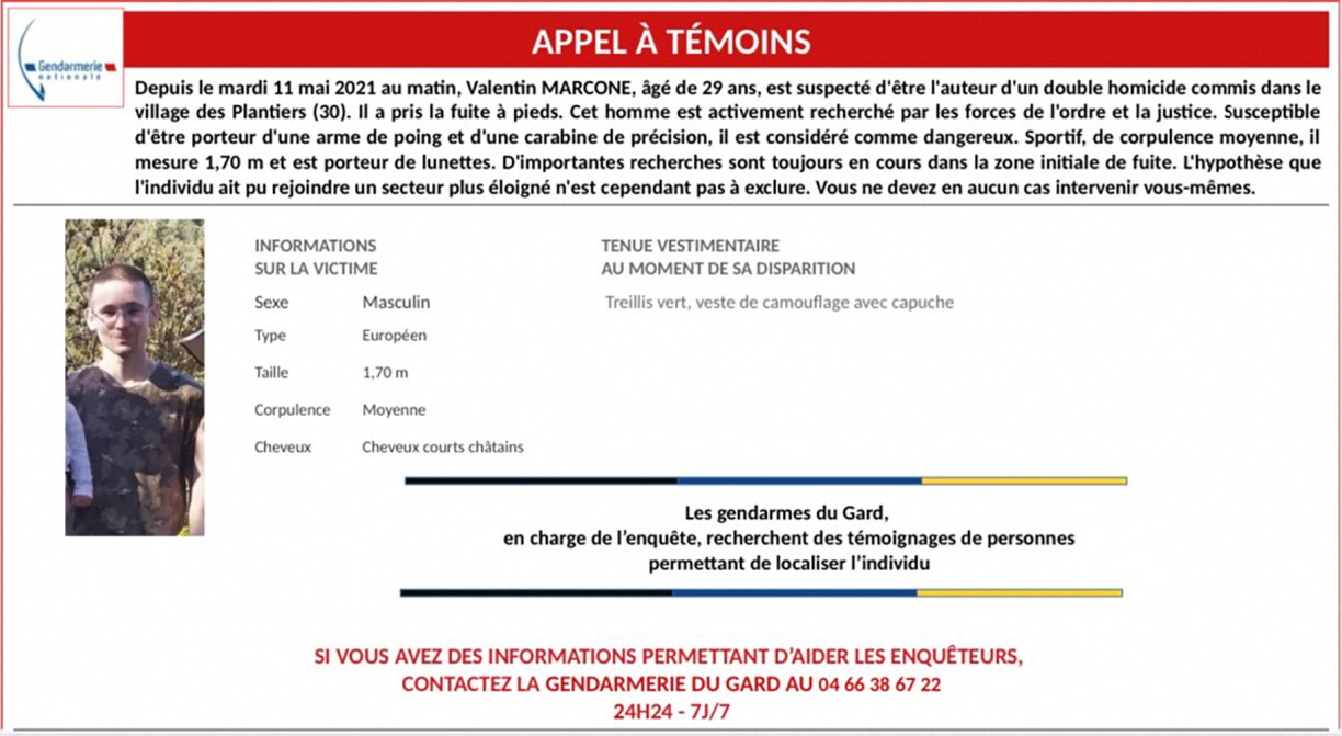 Via cet appel, lancé sur le compte Twitter de la gendarmerie de l’Hérault et le compte Facebook de la gendarmerie du Gard, les enquêteurs espèrent retrouver la trace de Valentin Marcone, 29 ans, cet homme soupçonné du double meurtre de mardi dans une scierie du petit village des Plantiers (Gard), sur les flancs du mont Aigoual, au coeur du parc des Cévennes.