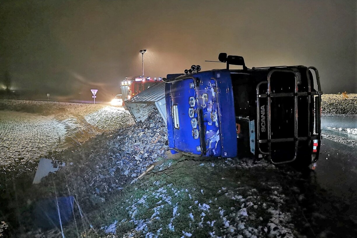 Pour une raison qui n’a pas encore été déterminée, sans doute la chaussée était-elle glissante un conducteur de camion a perdu le contrôle de son véhicule à la sortie du rond-point entre la D952 la D16. Il s’est couché sur le flanc et perdu son chargement.