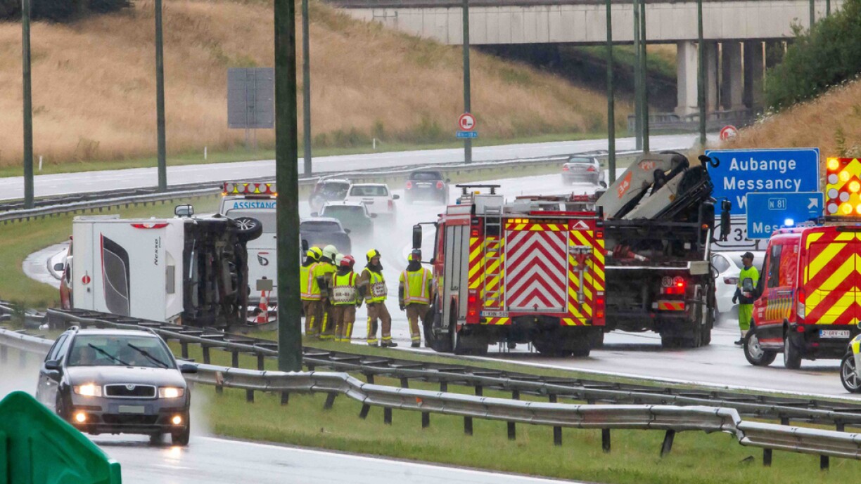Un camping-car et sa remorque se sont retrouvés sur le flanc sur la voie de dépassement. L’accident a fait deux blessés légers.