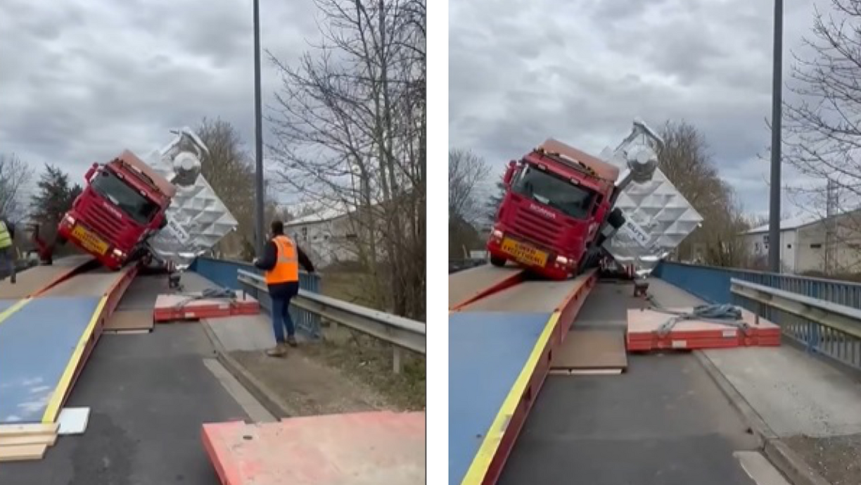 Dans une vidéo partagée par le média local Lunéville Actualités, on peut voir le camion basculer lentement sur le côté, s’arrêtant par miracle sur la barrière du pont.
