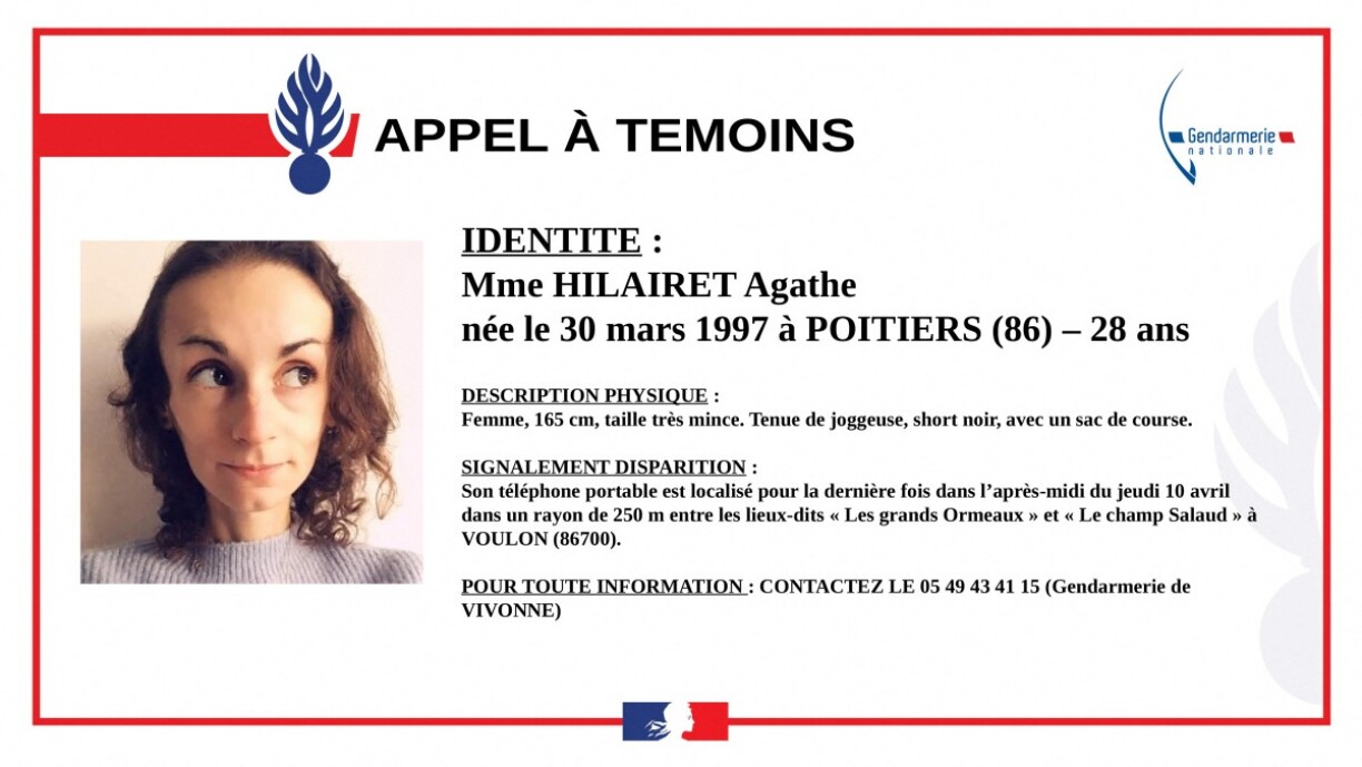 Le 10 avril, le père d’Agathe Hilairet avait donné l’alerte en ne la voyant pas revenir alors que son téléphone ne répondait plus.