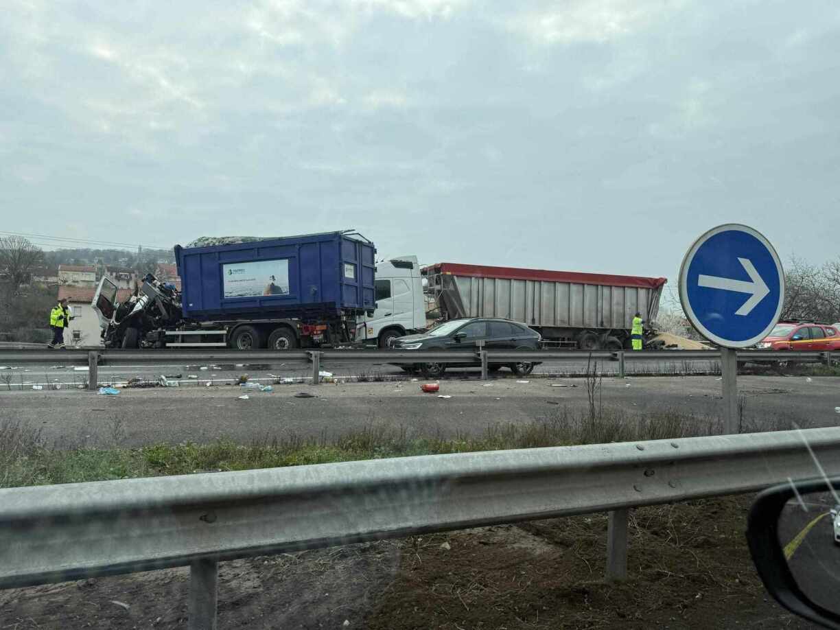 Les deux camions se sont percutés. Le camion qui se trouve devant est fortement endommagé au niveau de la cabine et de son chargement. Le camion qui suit a son chargement étalé sur la chaussée.