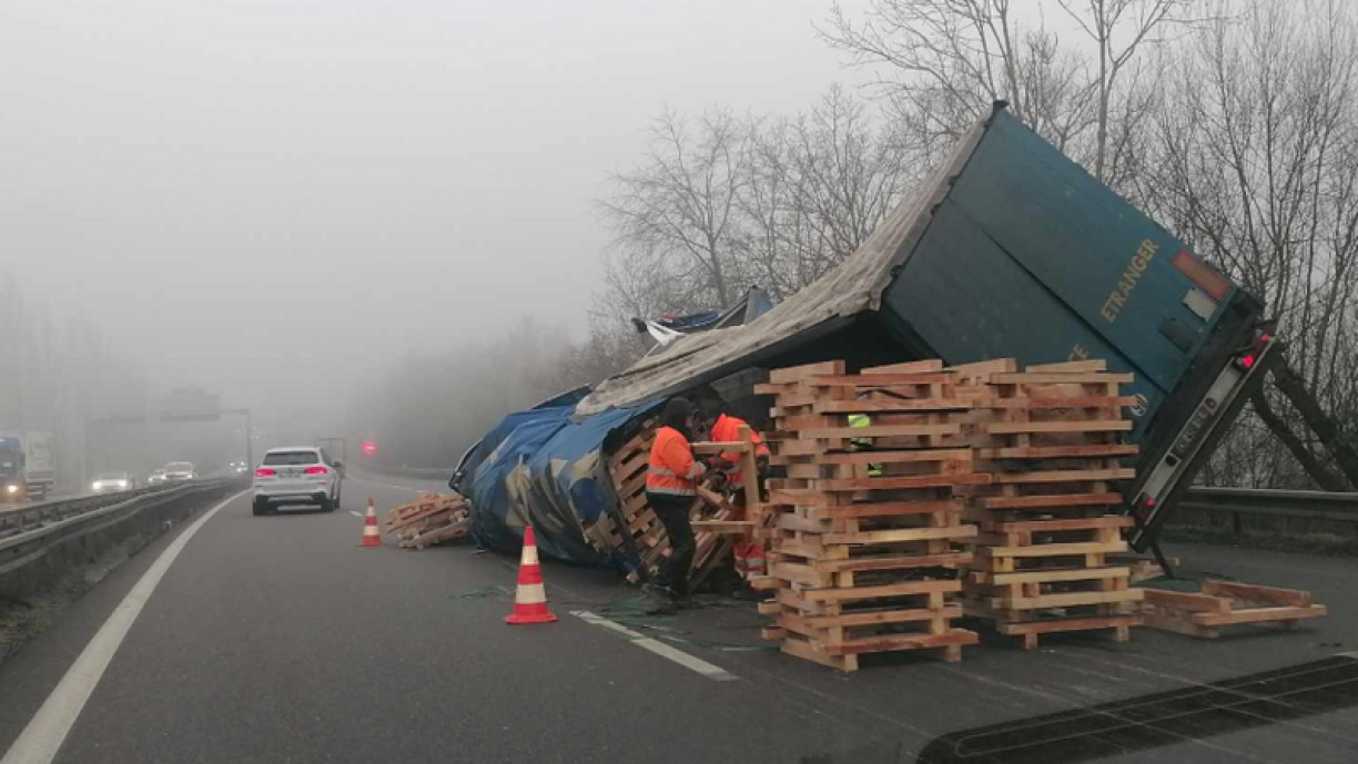 Pour l’heure, la voie de droite est condamnée. Le temps de ramasser les palettes et ensuite d’évacuer la remorque du 38 tonnes, complètement disloquée au niveau de sa structure.