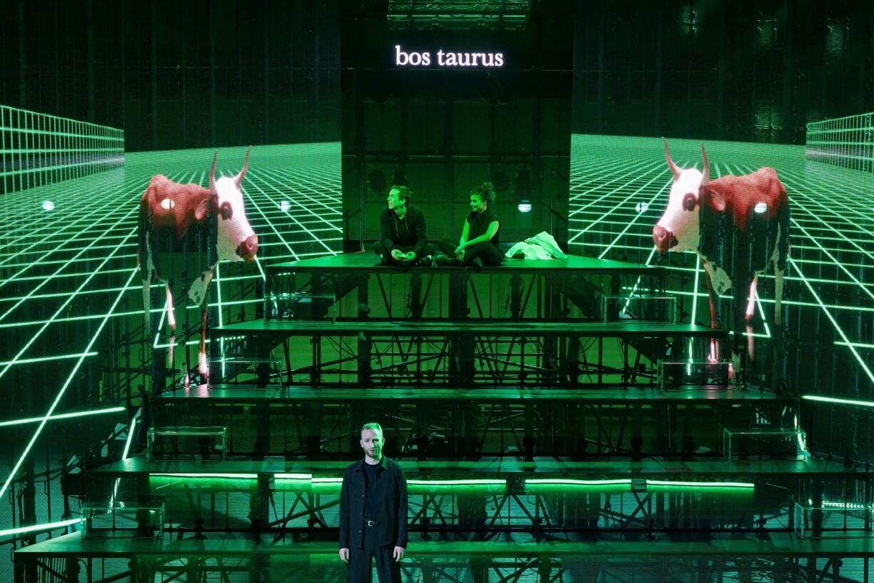 Un cheval ou une vache modélisés en 3D, le “metahuman” du physicien théoricien Albert Einstein... Le metteur en scène Kevin Barz a voulu, en s’inspirant de la genèse biblique du monde, l’associer à l’histoire scientifique et aux progrès et enjeux du XXIe siècle.