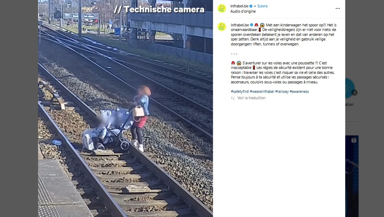 “S’aventurer sur les voies avec une poussette?! C’est inacceptable”, écrit sur les réseaux sociaux Infrabel. “Les règles de sécurité existent pour une bonne raison: traverser les voies, c’est risquer sa vie et celle des autres”, poursuit le gestionnaire, ajoutant: “Pense toujours à ta sécurité et utilise les passages sécurisés: ascenseurs, couloirs sous-voies ou passages à niveau”.