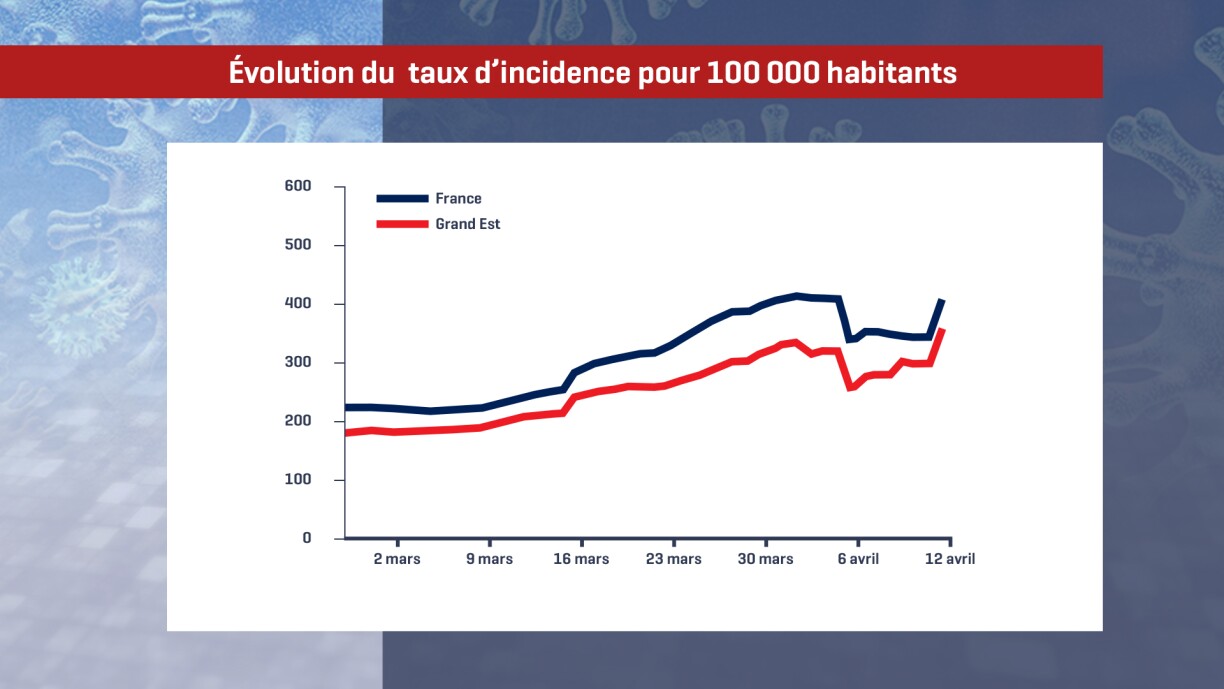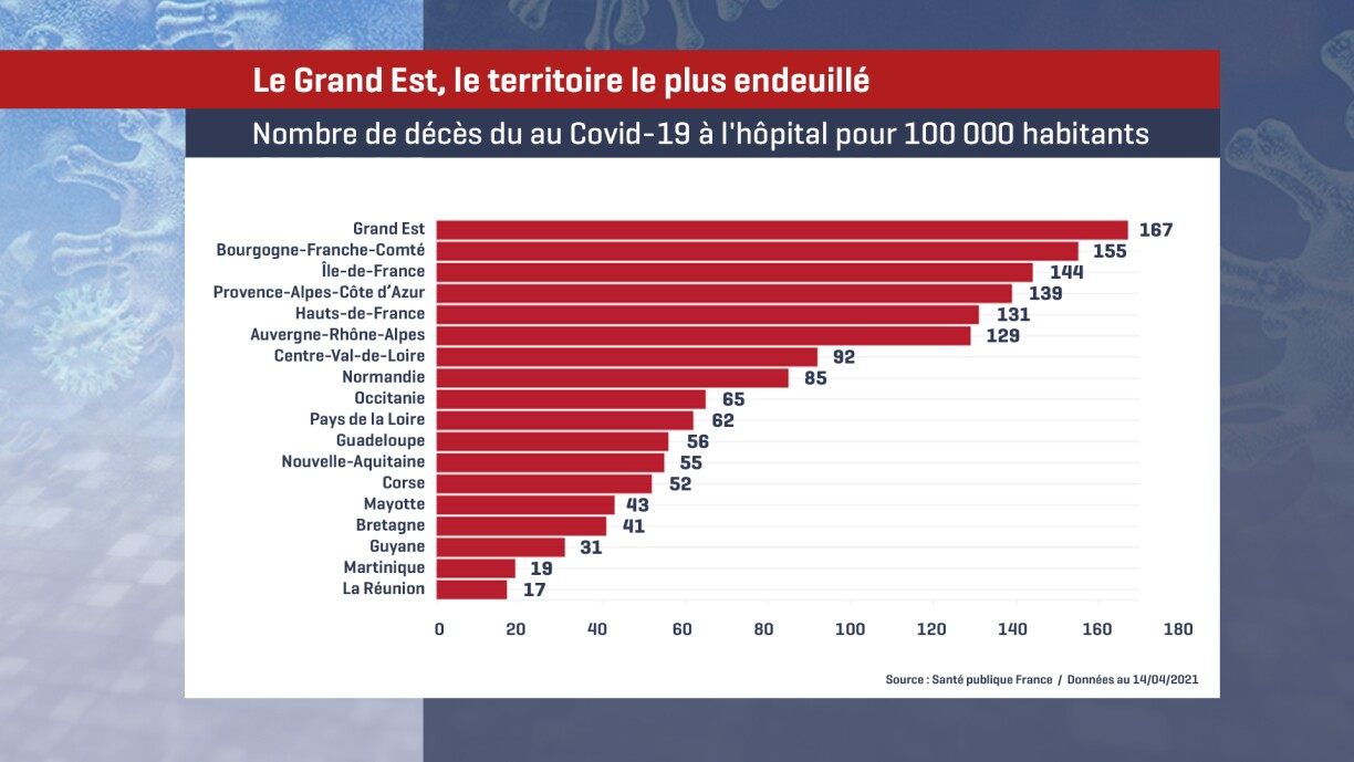 Il n’en reste pas moins que les chiffres de contamination restent élevés. Les indicateurs semblent se stabiliser, mais à un niveau élevé. Avec plus de 5.900 malades en réanimation, au plus haut depuis le printemps 2020, la troisième vague de l’épidémie de Covid-19 “n’est pas derrière nous” et le “pic des hospitalisations n’est pas atteint” a déclaré mercredi le porte-parole du gouvernement français, Gabriel Attal. Il ajoute que la Meuse, la Moselle et la Meurthe-et-Moselle “connaissent toujours une situation fragile”. En France, la barre des 100.000 morts a été dépassée. Et avec 9234 morts liés au Covid, la région Grand Est est la plus endeuillée de l’hexagone. En effet, si l’on rapporte le nombre de décès à la population, c’est le Grand Est qui paye le plus lourd tribut à l’épidémie avec 167 décès pour 100 000 habitants.