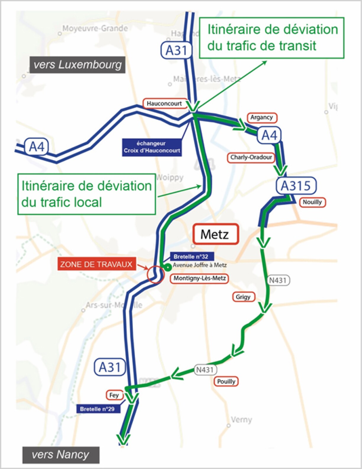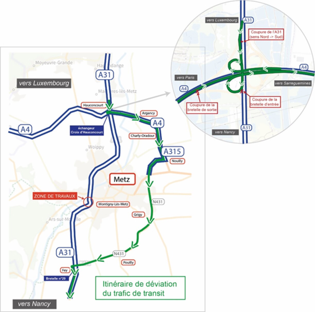 Durant toutes les nuits de coupure de l’A31, des déviations seront mises en place. Les coupures de nuit sont effectives de 21h00 à 6h00. L’A31 est totalement fermée sur l’axe Metz-Nancy, entre l’échangeur d’Hauconcourt et l’échangeur n°31 à Moulins-lès-Metz. Les dates exactes n’ont pas été communiquées par la DIR Est.
