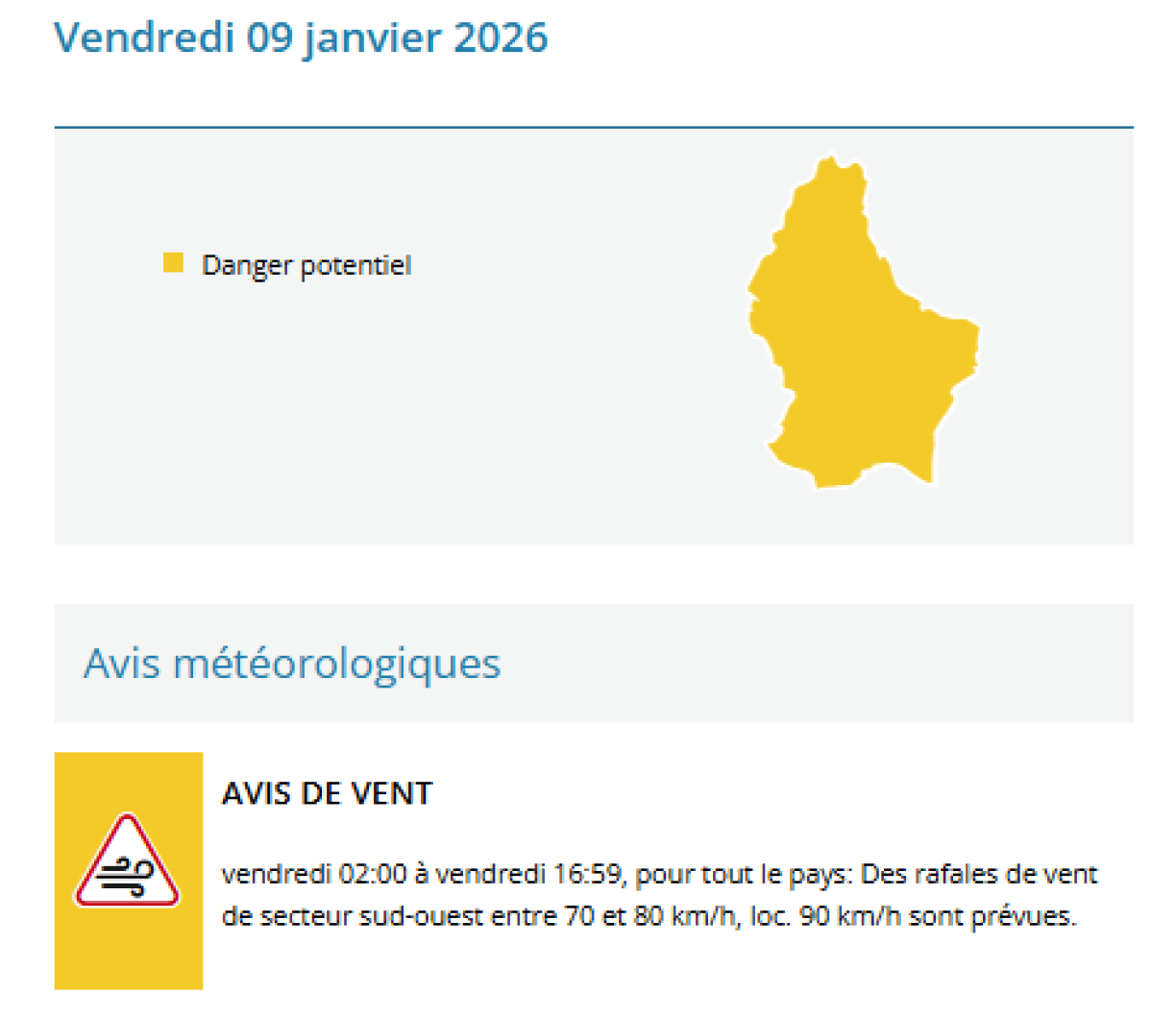 Les complications surviendront à partir de cette nuit. Météolux a émis pour ce vendredi un avis de vents forts de 2h du matin à 17h, avec des rafales de vent entre 70 et 80 km/h, jusqu’à 90 km/h localement.