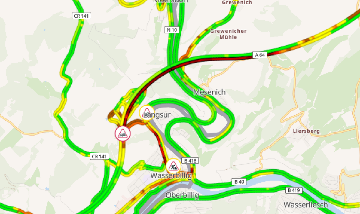 L’A64 est actuellement fermée dans le sens Allemagne-Luxembourg entre la sortie Trèves et la sortie Wasserbillig. Un énorme bouchon s’est formé sur l’A1 jusqu’à l’aire de Wasserbillig. Mais à 16h50, le CITA annonçait que la circulation avait repris sur deux voies dans le sens Luxembourg-Allemagne.