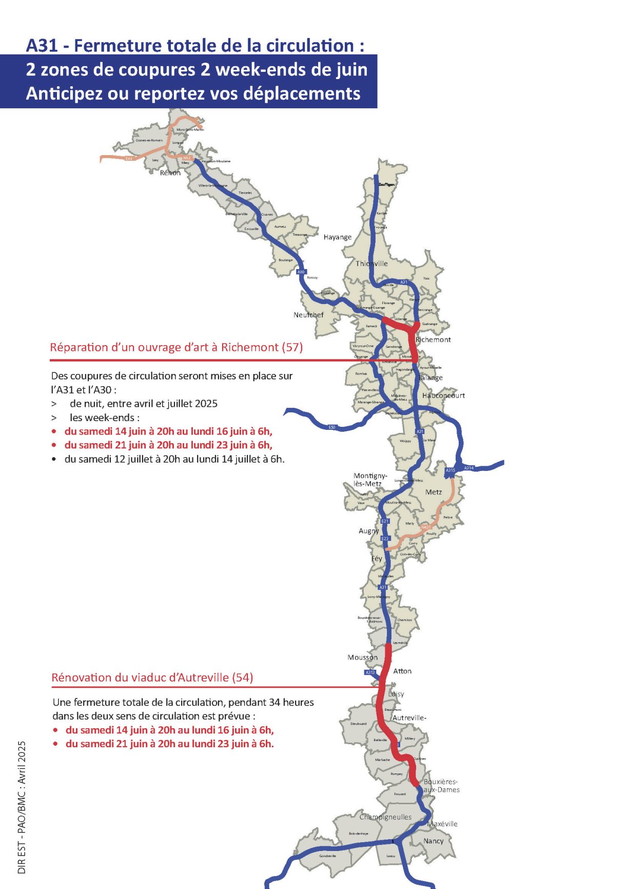 Enfin, une fermeture de l’A30 et de l’A31 est programmée dans le sens Nord>Sud la nuit, du mardi 3 juin à 21h au mercredi 4 juin à 5h (l’A31 sera fermée entre l’échangeur n°37.1 à Bertrange et l’échangeur n°37 à Mondelange; l’A30 sera fermée entre l’échangeur n°2b et le triangle de la Fensch. Cela occasionnera la fermeture de la bretelle d’entrée n°1 Uckange sur A30). Compte tenu des travaux, cela provoquera également la coupure, sur cette même période, de l’A31 entre l’échangeur n°37 (Mondelange) et 31.1 (Bertrange).