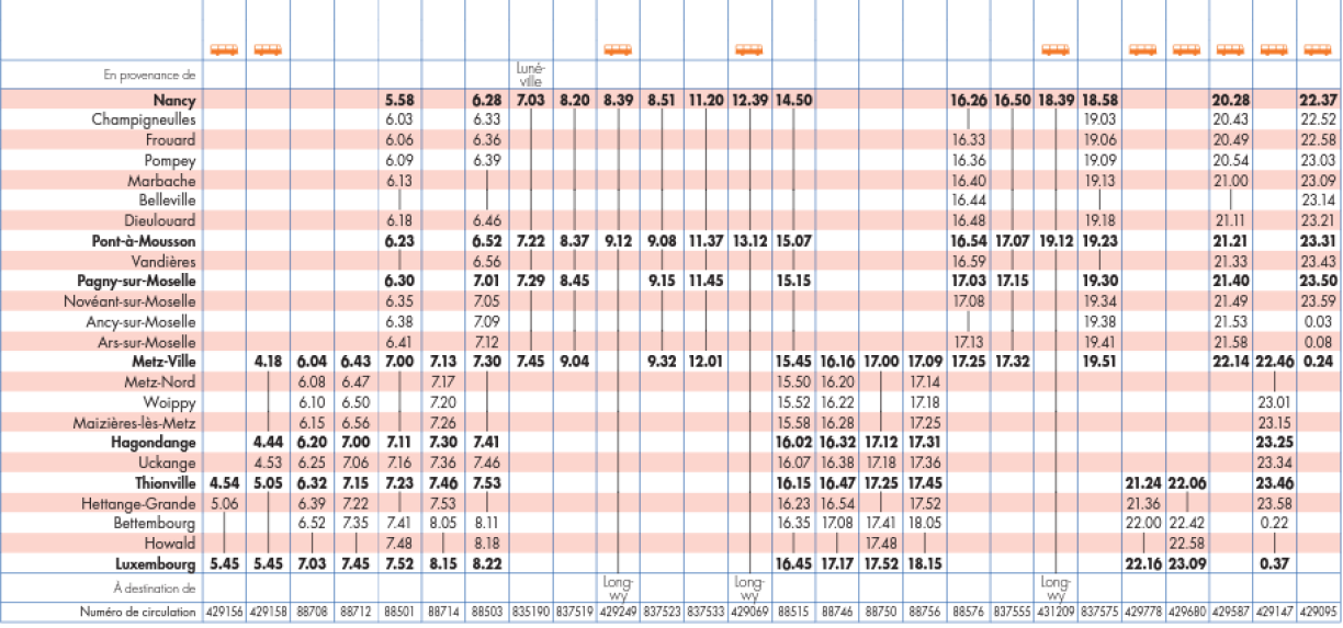 Le matin, seuls cinq trains circuleront entre Metz et Luxembourg. Le premier partira à 6h04 et le dernier à 7h30. Sur le chemin des retours, cinq liaisons sont prévues. La première pour 15h58 et la dernière pour 18h28. Des navettes feront également le trajet après 21h.