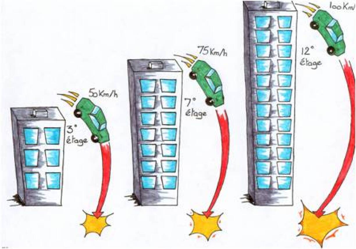 Enfin, voici une autre infographie qui montre qu’entre un impact à 50 km/h et à 90 km/h, la violence d’impact passe d’une chute d’un édifice de 3 étages à celle d’un édifice à 12 étages.