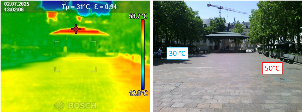 42 degrés, c’est la température affichée par le thermomètre du Knuedler en plein soleil. Une rue à côté, place d’Armes, une caméra thermique affiche 50°C au sol et 30°C sous l’ombre des arbres. Tout le monde est assis d’un seul côté de la place sous les arbres.
