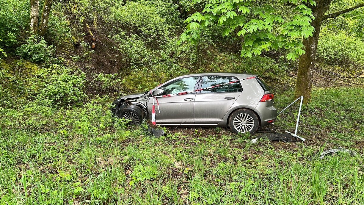 Dans un long virage à gauche, un conducteur a perdu le contrôle de son véhicule, qui a percuté un panneau indicateur ainsi que des barrières métalliques délimitant le parcours d'une course, avant de s'immobiliser près d'un talus.