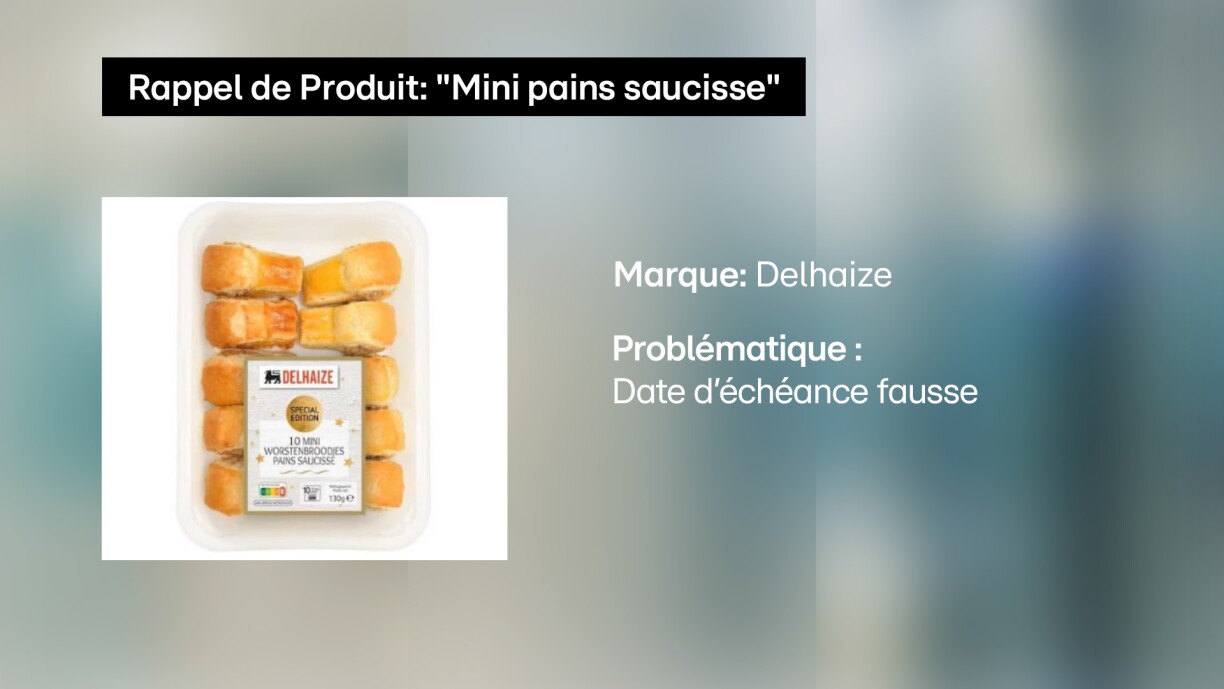 Delhaize Luxembourg retire de la vente le produit « Mini pains saucisse» de la marque Delhaize en raison d’une date de péremption erronée sur l’emballage (18/12/2025). La date de péremption correcte est le 06/11/2025. Période de commercialisation : du 18/10/2025 au 23/10/2025 inclus