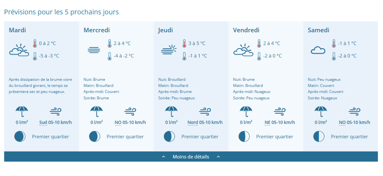 Le temps est localement brumeux, ensuite le temps se maintient toujours sec et peu nuageux durant l'après-midi. Les températures remonteront jusqu'à 2°C-4°C. La nuit sera brumeuse.