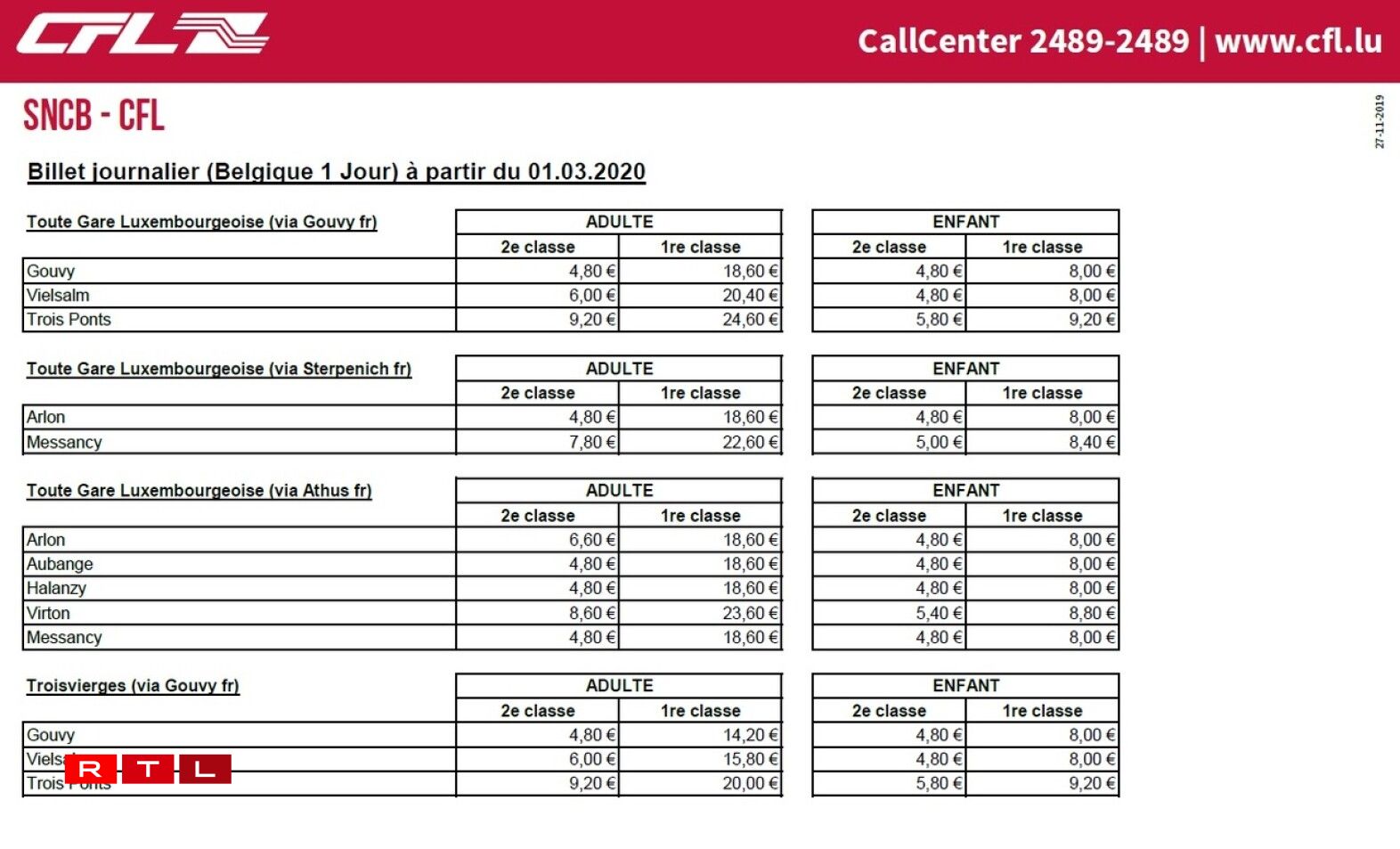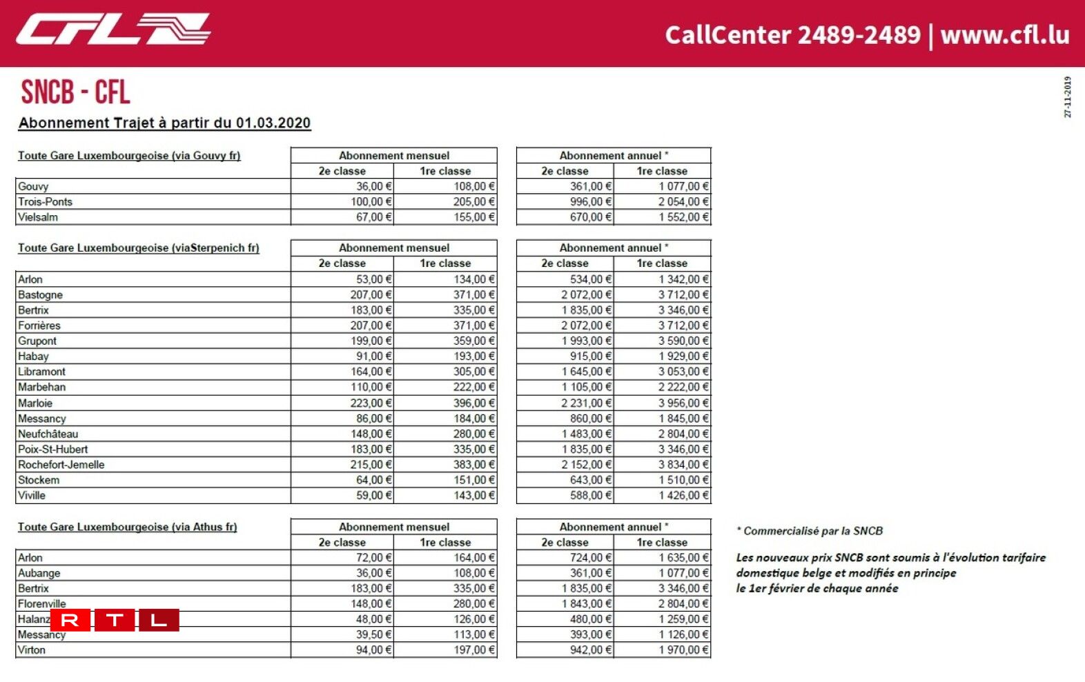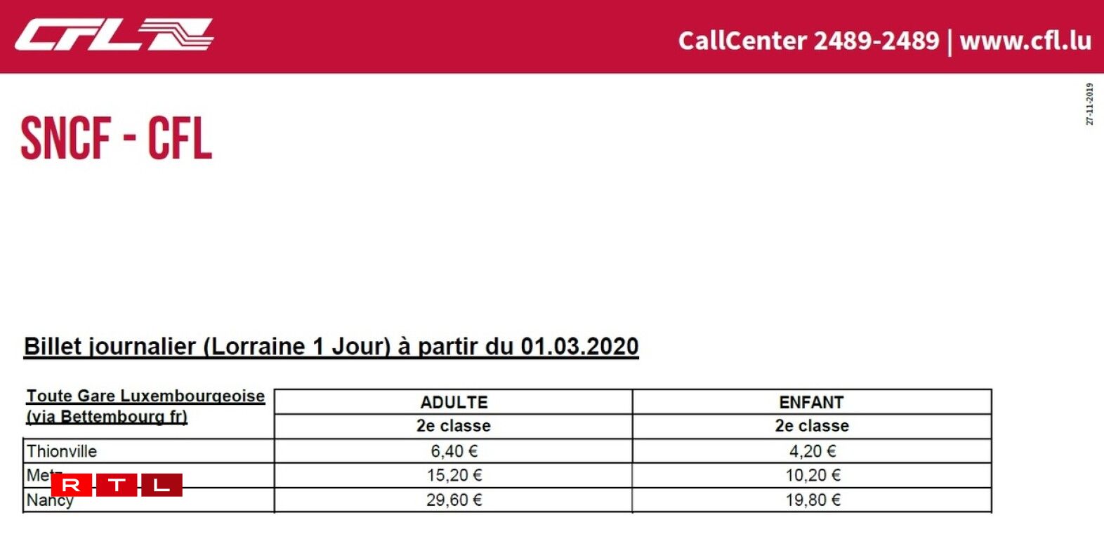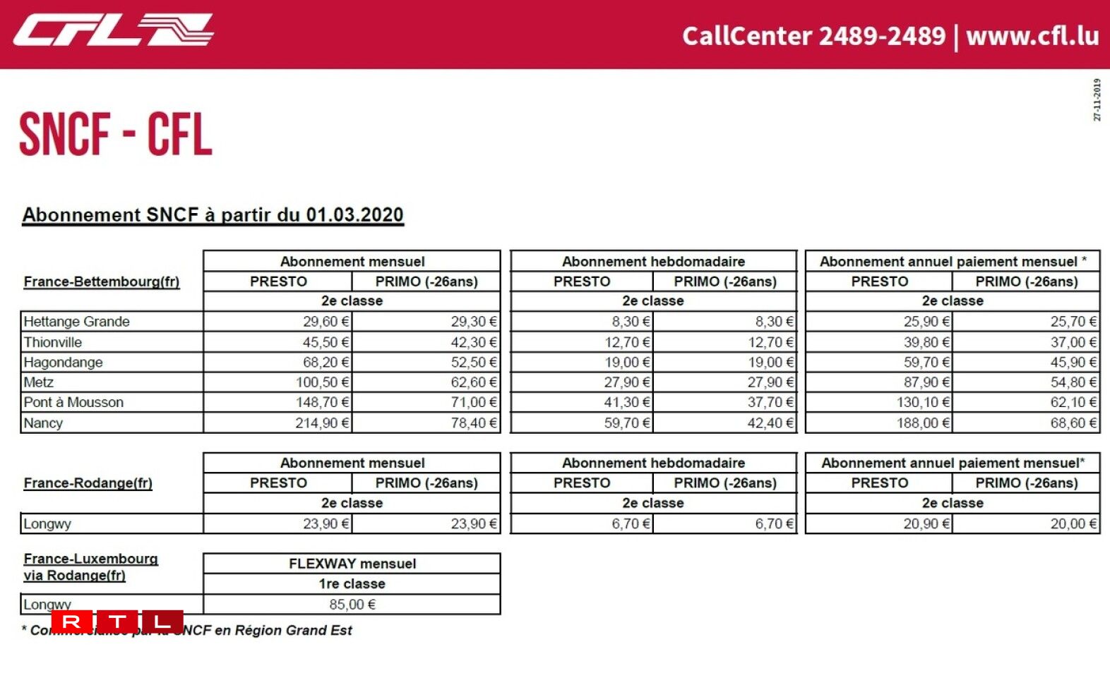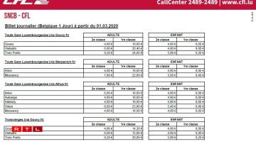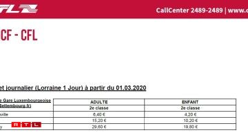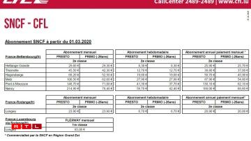 Vers la France: les tarifs SNCF/CFL sont en baisse de quelques dizaines d’euros. L’abonnement mensuel simple pour Thionville descend à 45,50€ (Abonnement Presto) voire 42,30€ (Abonnement Primo pour les -26 ans) et à 100,50€ et 62,60€ pour Metz.