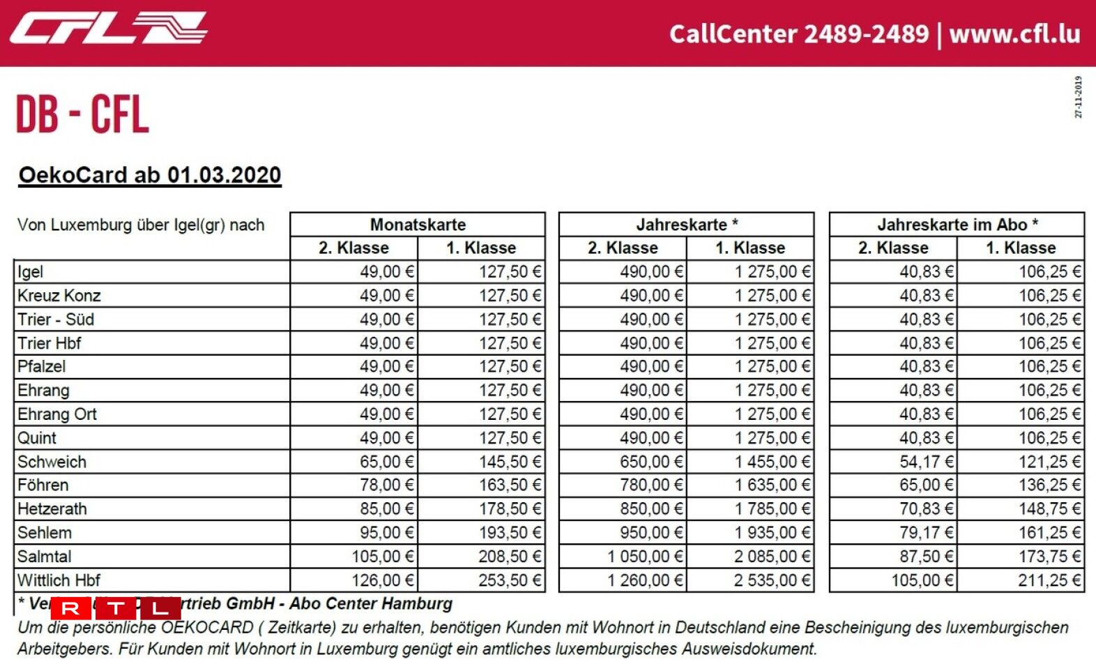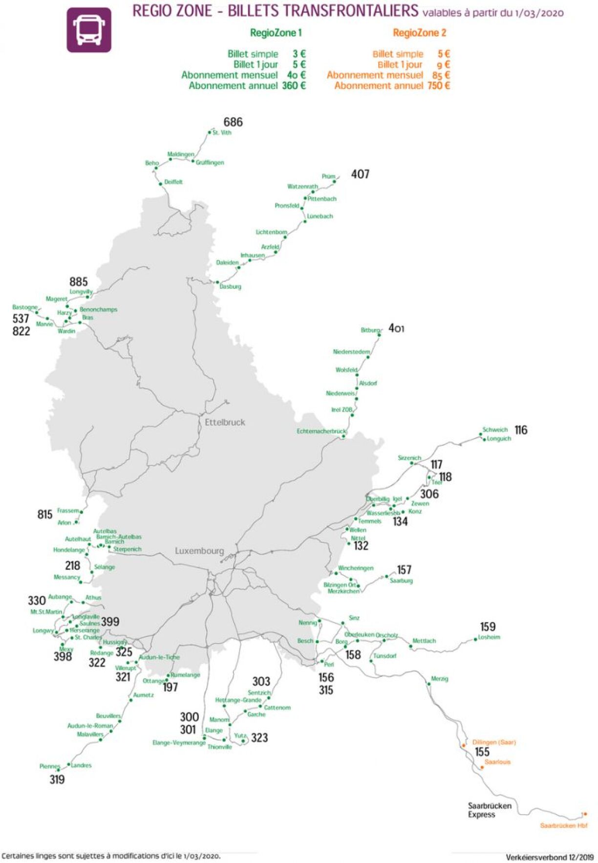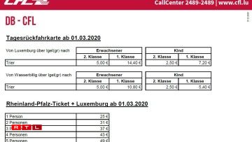 Le Verkéiersverbond a annoncé avoir adapté “en fonction de leur éloignement par rapport au Luxembourg” les tarifs RegioZone 1 et 2. La première catégorie regroupe la quasi-totalité des destinations proches de la frontière, la deuxième ne concerne que les trajets vers la Sarre (Dillingen, Saarlouis, Sarrebruck).