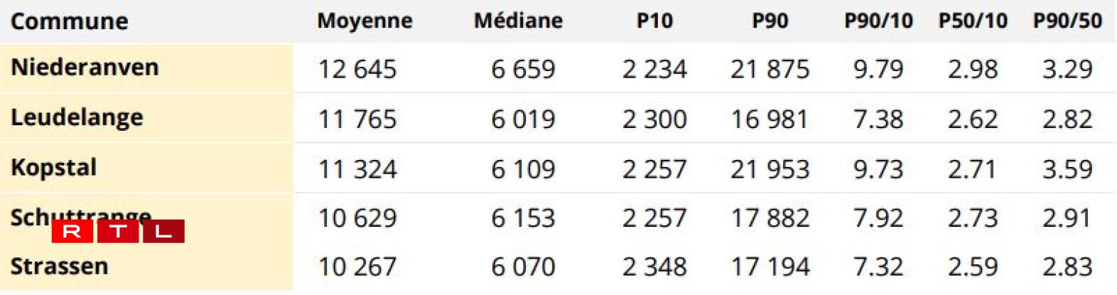 Après Niederanven, on retrouve la commune de Leudelange qui affiche un salaire moyen de 11.765 euros. Suivent les communes de Kopstal (11.324 euros), Schuttrange (10.629 euros) et enfin, celle de Strassen (10.267 euros). Pour rappel, dans ces localités 50% des résidents gagnent plus de 6.000 euros par mois.