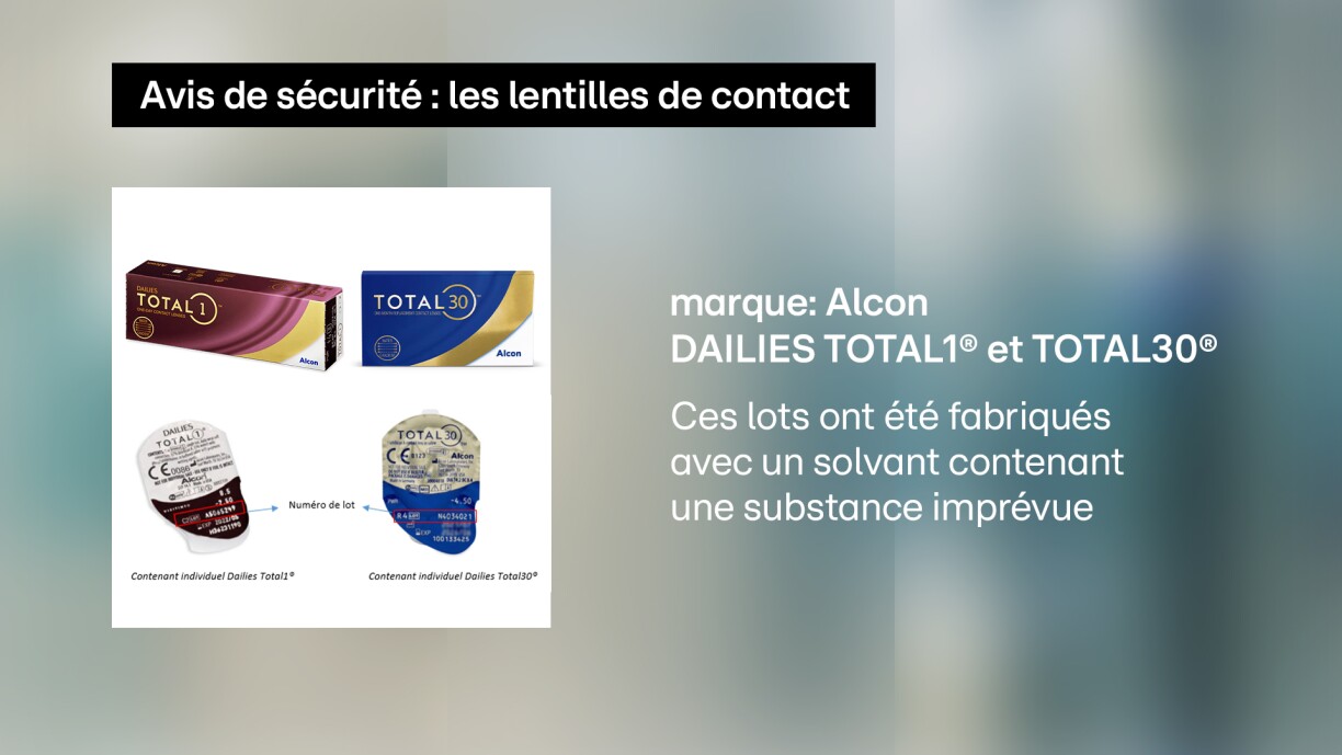 Les produits concernés sont les lentilles de contact journalières de marque Alcon, et plus particulièrement des gammes "DAILIES TOTAL1" et "TOTAL30".