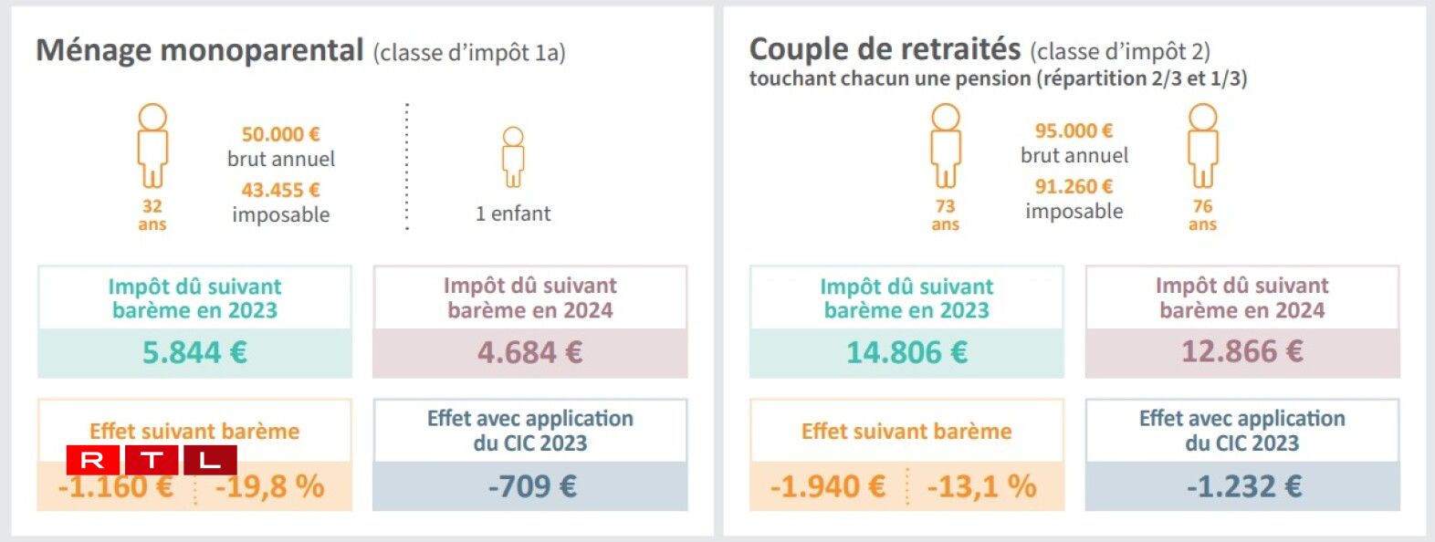 Chez un couple de retraités, avec 95.000€ brut par an, la baisse d’impôt leur fera économiser 160€ par mois.