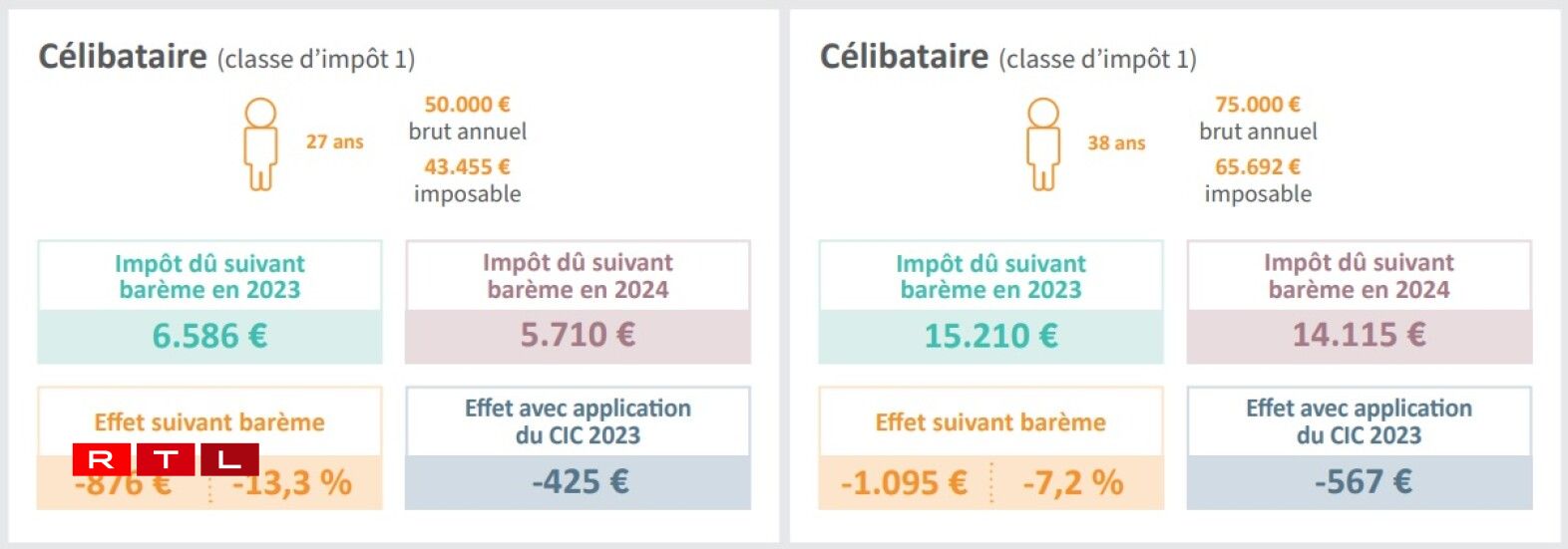 Pour un parent isolé avec un enfant et 50.000€ de revenu brut par an, le gain atteint 1160€ par an. Soit près de 100€ par mois !